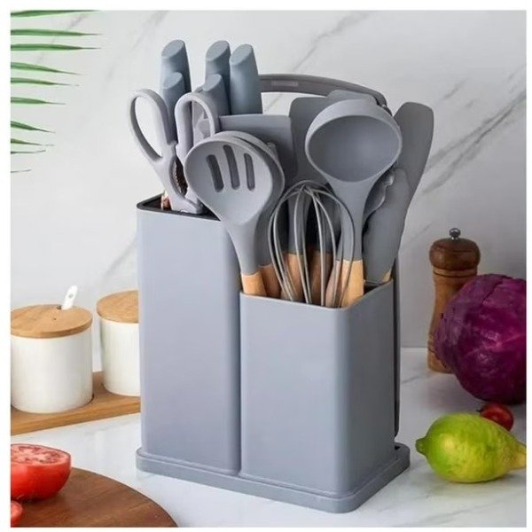 Incluye cuchillos con filo duradero, utensilios resistentes al calor, tijera multiuso y porta-utensilios de diseño. Perfecto para cocinar sin rayar tus ollas y sartenes antiadherentes.